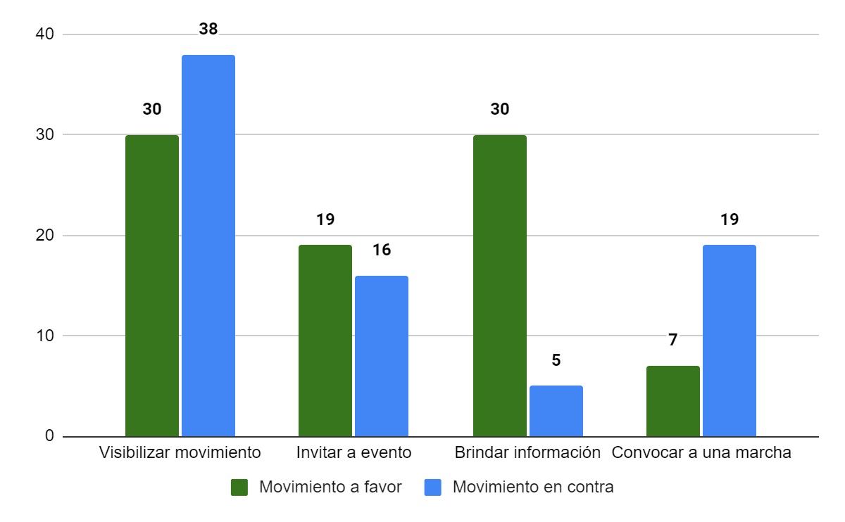 Este ciclo de legitimación también es relevante para entender cómo el brindar información fue uno de los objetivos estratégicos más destacables en el análisis de las publicaciones. En particular, el movimiento a favor fue el que más se focalizó en brindar información, con 30 publicaciones sobre las 5 del movimiento en contra. Esto habla de diferentes maneras de acercar y usar la información disponible: