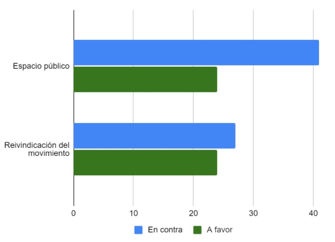 En ambos movimientos sociales los temas que más resaltan en las publicaciones son el espacio público y la reivindicación del movimiento. De un total de 102 publicaciones, el primer tema se encuentra presente en 65 publicaciones mientras que el segundo se encuentra en 51 publicaciones.