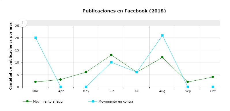 El total de publicaciones en Facebook de ambos movimientos entre los meses de marzo y octubre del 2018 fue de 102, siendo 54 del movimiento en contra de la IVE y 48 del movimiento a favor. En el Gráfico N.º 1 se puede observar que la mayor cantidad de publicaciones ocurrieron en marzo, junio y agosto.