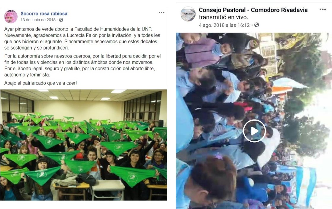 Una estrategia similar puede encontrarse en el movimiento en contra: la página Argentinos por la vida Comodoro Rivadavia compartió el 5 de agosto una nota del sitio web de Canal 9 realizada a la Diputada Ana Llanos durante una marcha por la vida. Una diferencia que se puede evidenciar es que a estas estrategias que articulan la presencia en el espacio público, la visibilización y la reivindicación de su causa, se le suma la presencia de figuras políticas que actúan y hablan como referentes del movimiento.