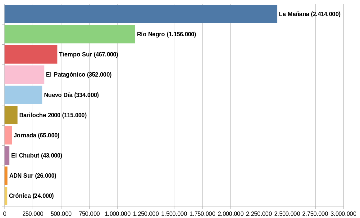 De acuerdo con el ranking que elabora ComScore, referido a los sitios de noticias de la Patagonia, las estadísticas disponibles a diciembre de 2018 (Gráfico N.º 1) muestran que con 352 mil visitas únicas durante ese mes El Patagónico aparece cuarto detrás de La Mañana, de Neuquén (2.414.000 visitas únicas), Río Negro, de General Roca (1.156.000) y Tiempo Sur de Río Gallegos (467.000)3.