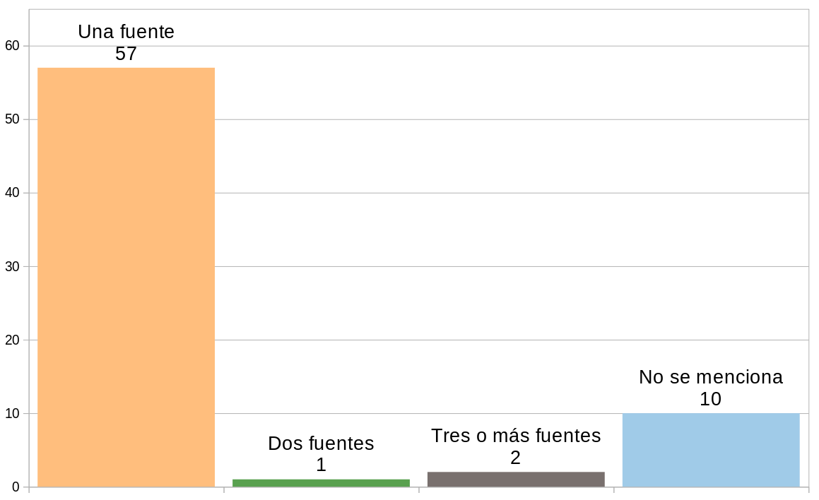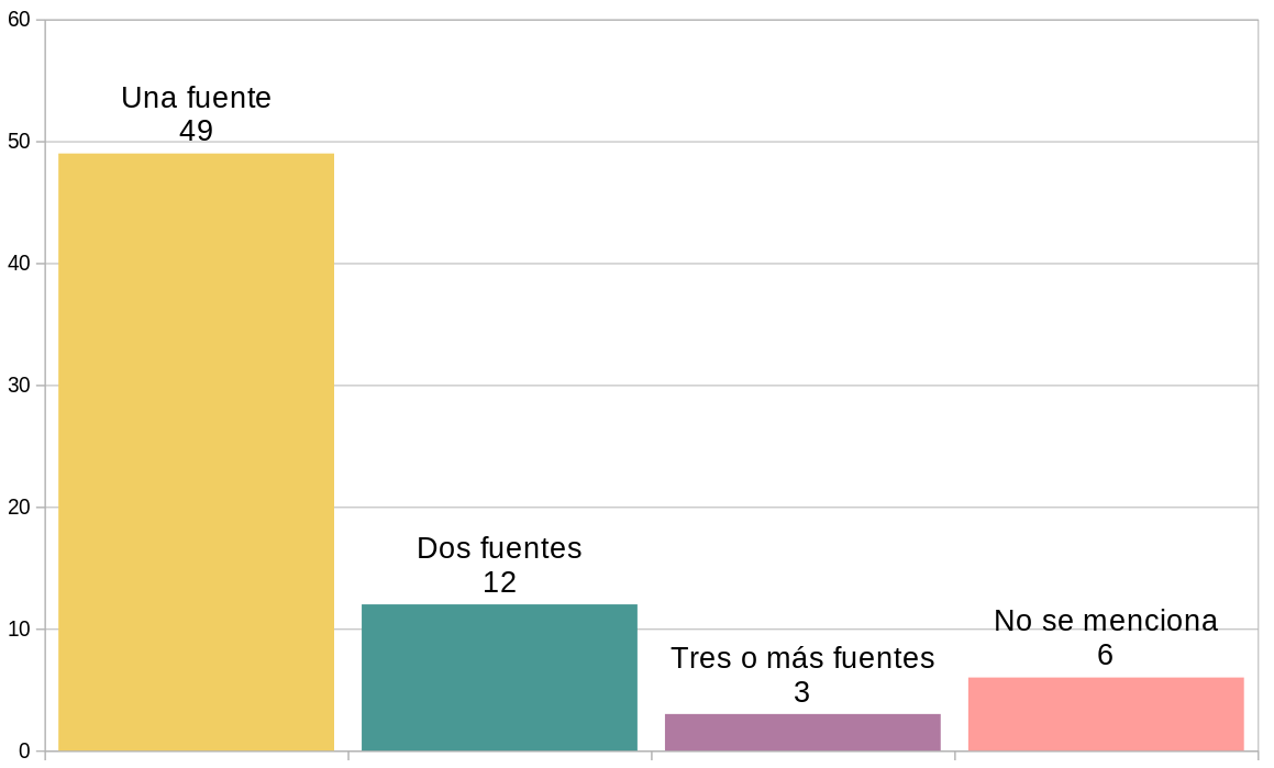 El promedio de notas de ADN Sur (Gráfico N.º 3) basadas en una fuente única es del 81,43% (57 de las 70), mientras que solo el 1,43% (1 de 70) emplea dos fuentes y el 2,86% (2 de 70) menciona tres o más fuentes. En el caso de las notas donde no existe atribución de fuentes llega al 14,28% (10 de 70).