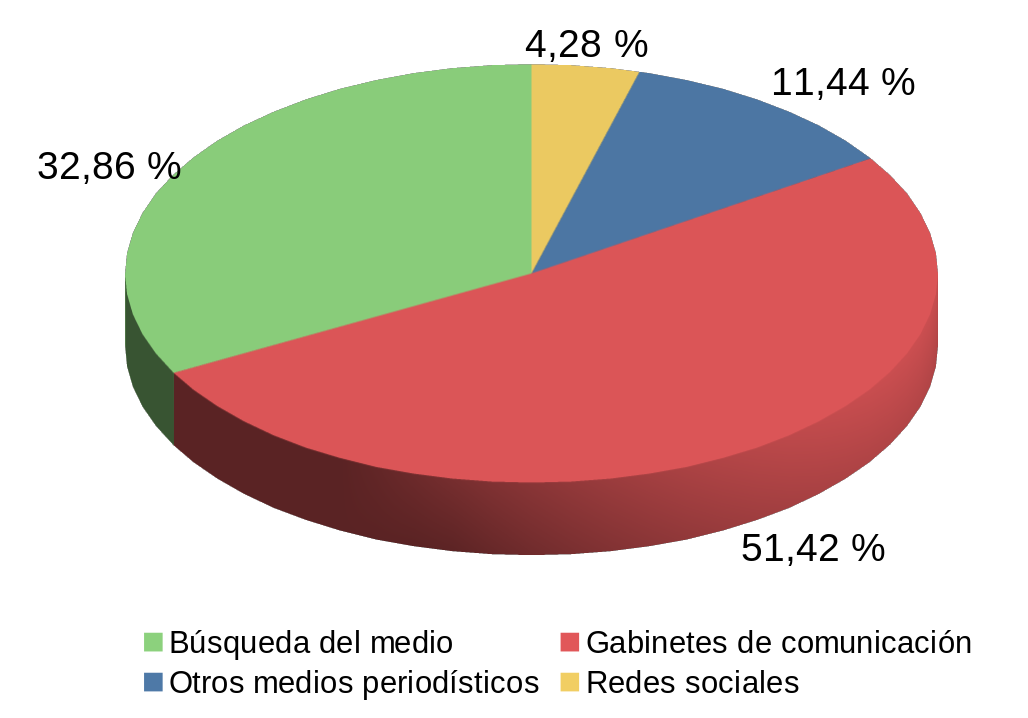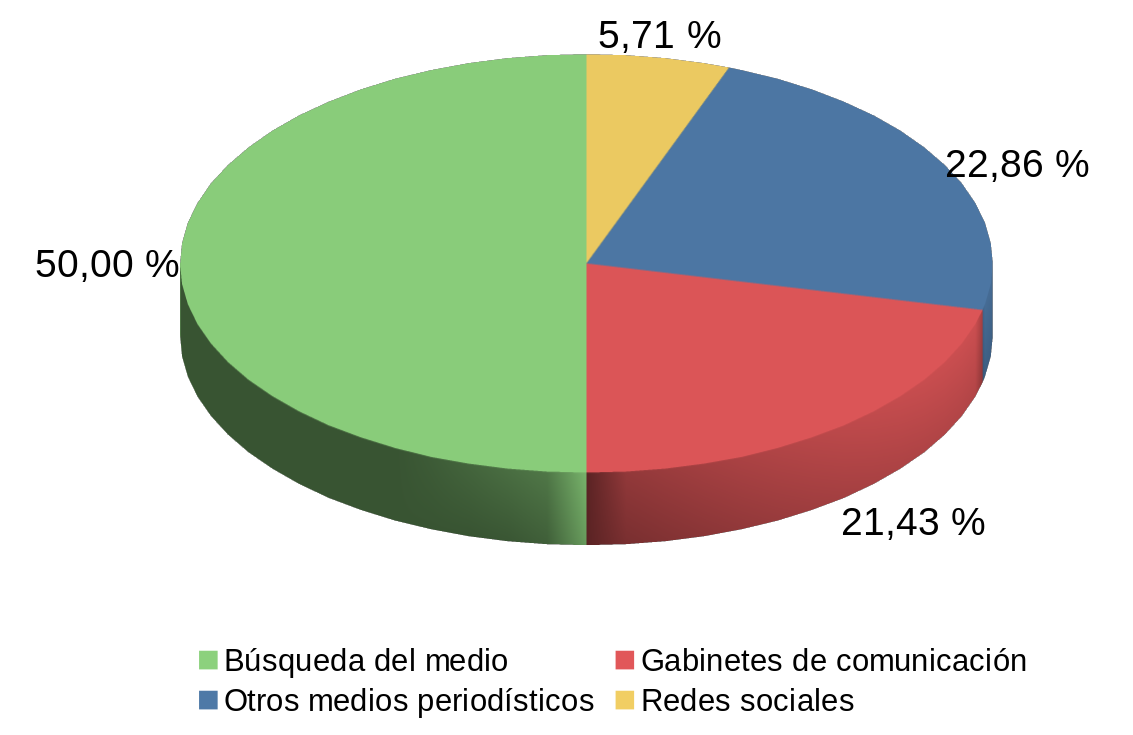Respecto a la procedencia de la información (Gráfico N.º 4), el análisis de las piezas noticiosas de El Patagónico permite establecer que el 32,86% se obtuvo a partir de la iniciativa del medio, es decir de su propio reporteo; el 4,28% fue elaborada a partir de publicaciones en las redes sociales Facebook o Twitter; el 11,44% fue tomada de publicaciones de otros medios periodísticos que se mencionan como fuente y el 51,42% está basada en gacetillas de prensa elaboradas por gabinetes de comunicación de organismos gubernamentales y otras instituciones. Sin embargo, en ninguno de los casos de información basada en gacetillas se menciona que esa sea la fuente.