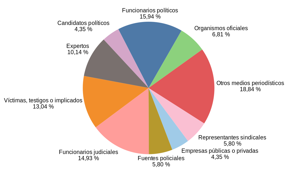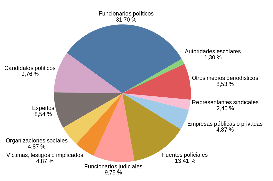 En cuanto a su tipo las fuentes han sido catalogadas como: 1) personales (si se menciona a personas como funcionarios políticos; funcionarios judiciales; dirigentes gremiales; autoridades policiales; usuarios de redes sociales; representantes de instituciones intermedias como asociaciones vecinales y ONG; expertos; protagonistas, víctimas, familiares, testigos o afectados por el acontecimiento que se relata) e institucionales (aquellas donde se identifica a una institución, pero no a una persona específica, como la policía, el gremio docente, la Justicia, por citar algunas ejemplos) y 2) fuentes documentales (expedientes judiciales, decretos, leyes, etcétera) y estadísticas (censos, estudios y todo tipo de relevamiento similar).