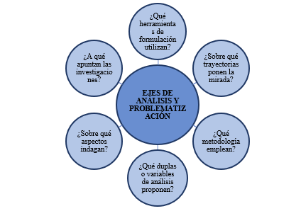 Frente la producción encontrada se pueden enmarcar algunos ejes conceptuales, de problematización e intervención, así como enfoques y metodologías de investigación formuladas o consideradas dentro del ponderado investigativo revisado. Lo que se relaciona a continuación a través de una gráfica son las preguntas que orientan la revisión de la bibliografía, exponiéndose de manera breve lo encontrado frente a cada una y los autores que hacen parte de dicha búsqueda: