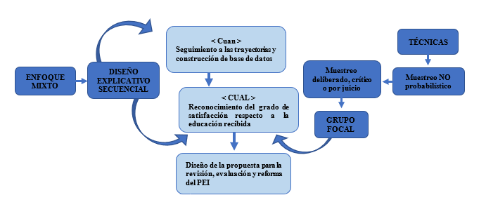 The population was made up of students graduated between the years 2006 - 2018; It is a mixed-type study with a preponderance of the qualitative approach, explored from the sequential explanatory design; it is possible that, on the one hand, quantitative data is analyzed where a survey form appears for the knowledge of the trajectories of the graduates, as well as their satisfaction with the education received; and on the other, a non-probabilistic sampling for the formation of a focus group, which allowed the collection of qualitative data, in favor of an institutional reform.