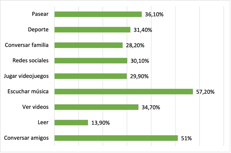 Un primer acercamiento al hábito lector de estudiantes de Enseñanza Media de liceos rurales de la Región de Aysén fue identificar las actividades que ellos realizan en su tiempo libre, en el cual la lectura no se sitúa en las principales preferencias, sino más bien es la última, pero las actividades escogidas de igual forma entregan información con la que se identifican ciertas habilidades y procesos que la misma lectura propicia. “Escuchar música” (57,20%), es una actividad individual y centrada en el disfrute de una expresión artística, además, posee un texto poético, la mayoría de las veces, y quien lo escucha puede realizar un proceso interpretativo de lo recitado. En segundo lugar, está presente “conversar con amigos” (51%), práctica oral, que posee la mayoría de las veces narración de por medio, ya sea de historias, anécdotas, sentimiento y emociones; finalmente se identifica la actividad de “pasear” (36,10%) como algo característico del contexto en el cual están insertos los estudiantes de los establecimientos encuestados, ya que tal como se refirió anteriormente, estos liceos están en territorios específicos rodeados de abundante naturaleza, como también de Parques Nacionales orientados a la preservación y turismo.
