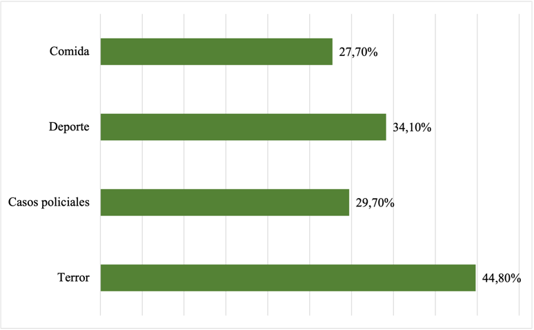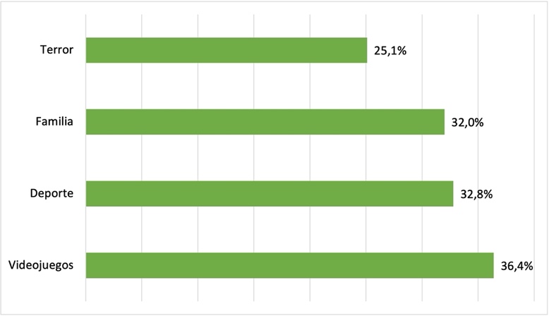 Por otro lado, los temas relacionados a la “familia” (32%) son una temática recurrente en las conversaciones entre amigos, ya sea de la propia, como la de otros; desde una orientación emocional o anecdótica. Finalmente, el tema del “terror” (25,1%) ocupa un espacio dentro de los principales resultados, abriendo una incógnita posible de abordar en un futuro, ya que no se logra comprender su orientación.