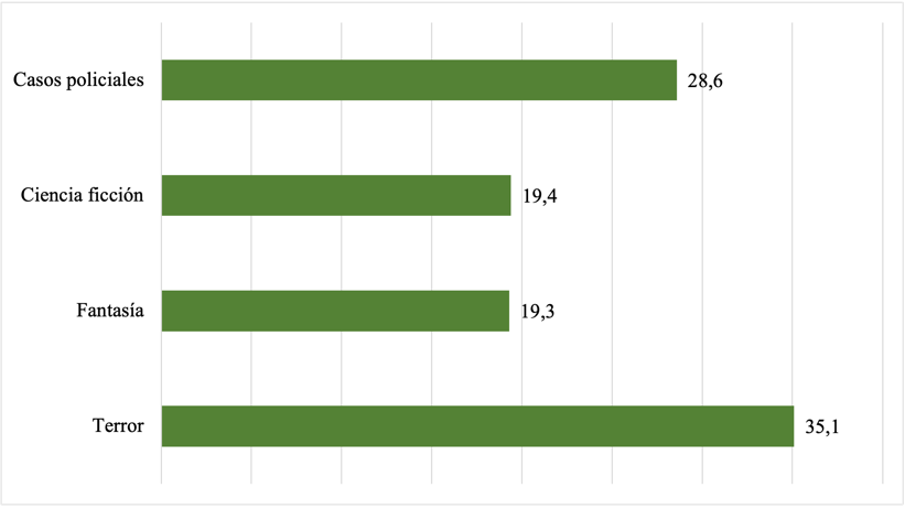 Finalmente, como última pregunta que se analizó para este estudio comparativo es el relacionado directamente a los temas que a los estudiantes les interesaría leer dentro de un contexto escolar, es así como se identifica claramente lo relacionado a la búsqueda de internet, en donde el “terror” (35,1%) es la temática preferida y que nuevamente se relaciona con los “casos policiales” (28,6%). Adicionalmente, dos temáticas nuevas aparecen dentro de las preferencias, a pesar de que con bastante distancia de la primera, que es la “ciencia ficción” (19,4%) y la “fantasía” (19,3%), relacionadas en alguna parte con el terror, pero también con las novelas de saga que a nivel mundial se publican orientadas a jóvenes lectores.