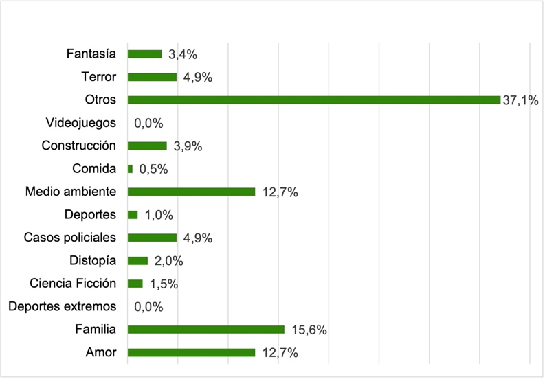 En comparación con las temáticas de interés reconocidas por los estudiantes, ya sea en la conversación como en las redes sociales, se identifica con mayor presencia la temática relacionada a la “familia” (15,6%), coincidiendo con la cantidad de textos presentes en los libros, luego con bastante distancia le sigue “casos policiales” (4,9%) y “fantasía” (3,4%), con relación a otros temas identificados por los estudiantes, se reconoce en los Libros Escolares Ministeriales el “deporte” (1%) y la “comida” (0,5%) con muy poca presencia, el porcentaje equivale entre 1 y 2 textos en los cuatro cursos y finalmente con respecto a los temas relacionados a los “Videojuegos” no se encontró texto alguno.